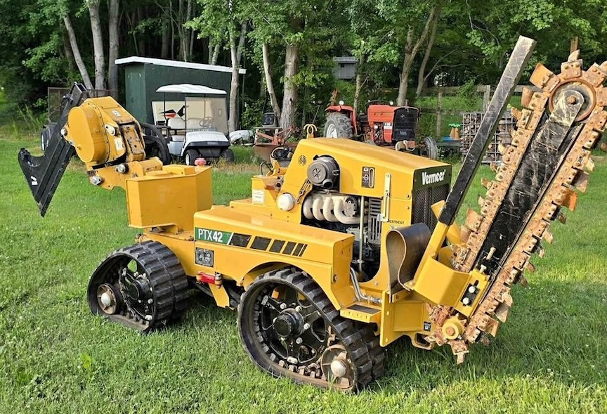 2023 Vermeer PTX42 Walk-Behind Track Plow/Trencher equipped with a 47 HP Kubota gas engine. Includes the following Vermeer attachments: TR44 trencher, VP44 plow, and PB44 boring attachment.